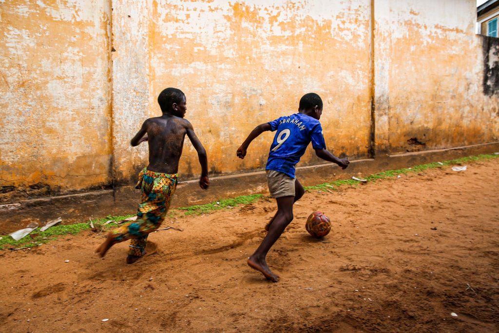 Crianças jogam futebol num beco de terra batida na aldeia de Grand-Popo, no Benin. O quadro vivo fala de tantas coisas e mensagens… a pureza